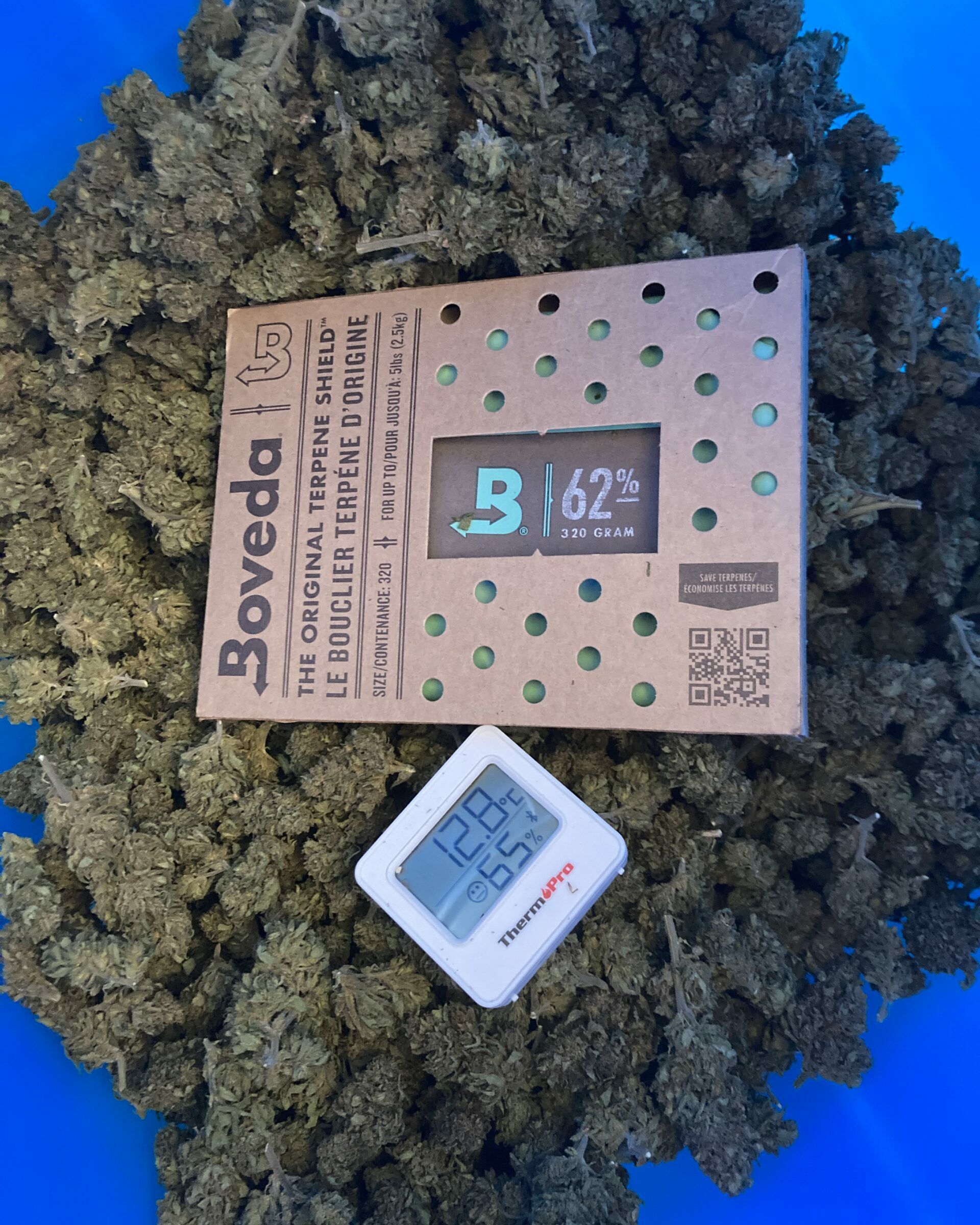 La dernière étape c’est l’affinage, ou “curing” en anglais. La matière est stockée dans des récipients hermétiques avec un taux d’humidité légèrement plus élevé que le résultat final attendu. Durant 3 à 5 semaines, le jeu consiste à ouvrir régulièrement les contenants (chacun équipé d’un hygro/thermomètre et d’un bouclier terpénique) pour chasser lentement les derniers pourcentages d’humidité et stabiliser la matière à son niveau optimal de séchage. Décembre arrive et la matière est enfin prête à être distribuée et transformée en de nombreux dérivés.
